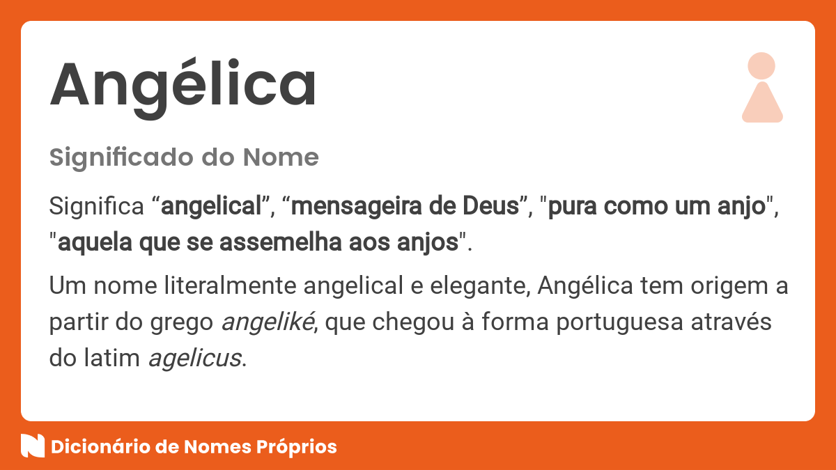Como um anjo ou pura. De origem latina, ele carrega consigo toda a delicadeza e pureza associadas aos anjos. As pessoas chamadas angélica costumam ser vistas como seres. Websignificado do nome angélica. Outra vertente, afirma derivar do grego angelos que significa “mensageiro” ou “enviado”.